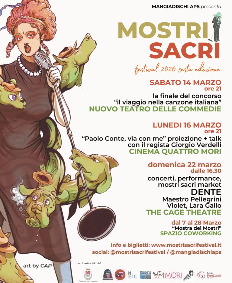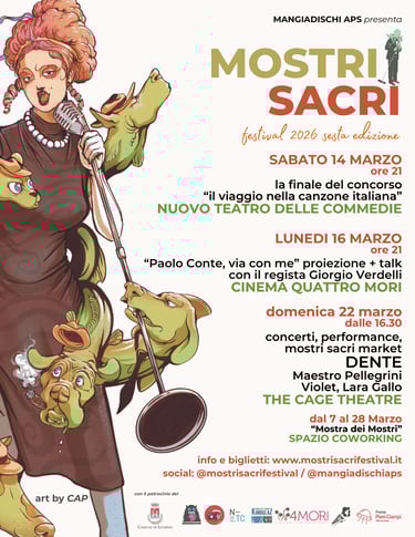 I mostri sacri della musica italiana celebrati nell'eccezionale venue del The Cage Theatre. All'interno del teatro, il mostri sacri market con banchetti selezionati a tema.