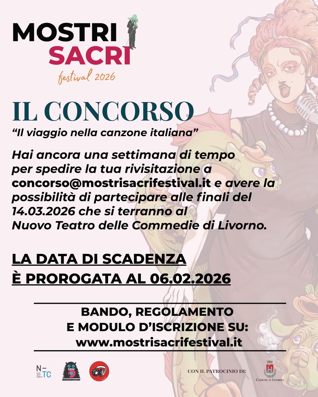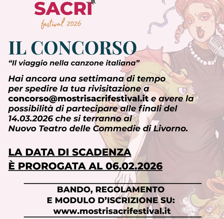 L'Associazione Mangiadischi APS indice per l'edizione 2026 di MOSTRI SACRI FESTIVAL un concorso musicale rivolto a cantanti, cantautori, cantautrici e band appassionati della musica italiana d'autore, senza limiti di età.
